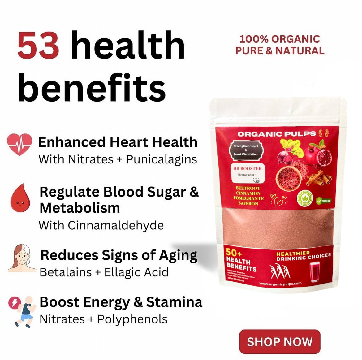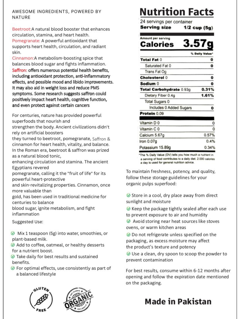 Organic Cardio Boost Superfood is 100% Organic blend of Saffron , Beet root , Pomegranate Seeds & Cinnamon.